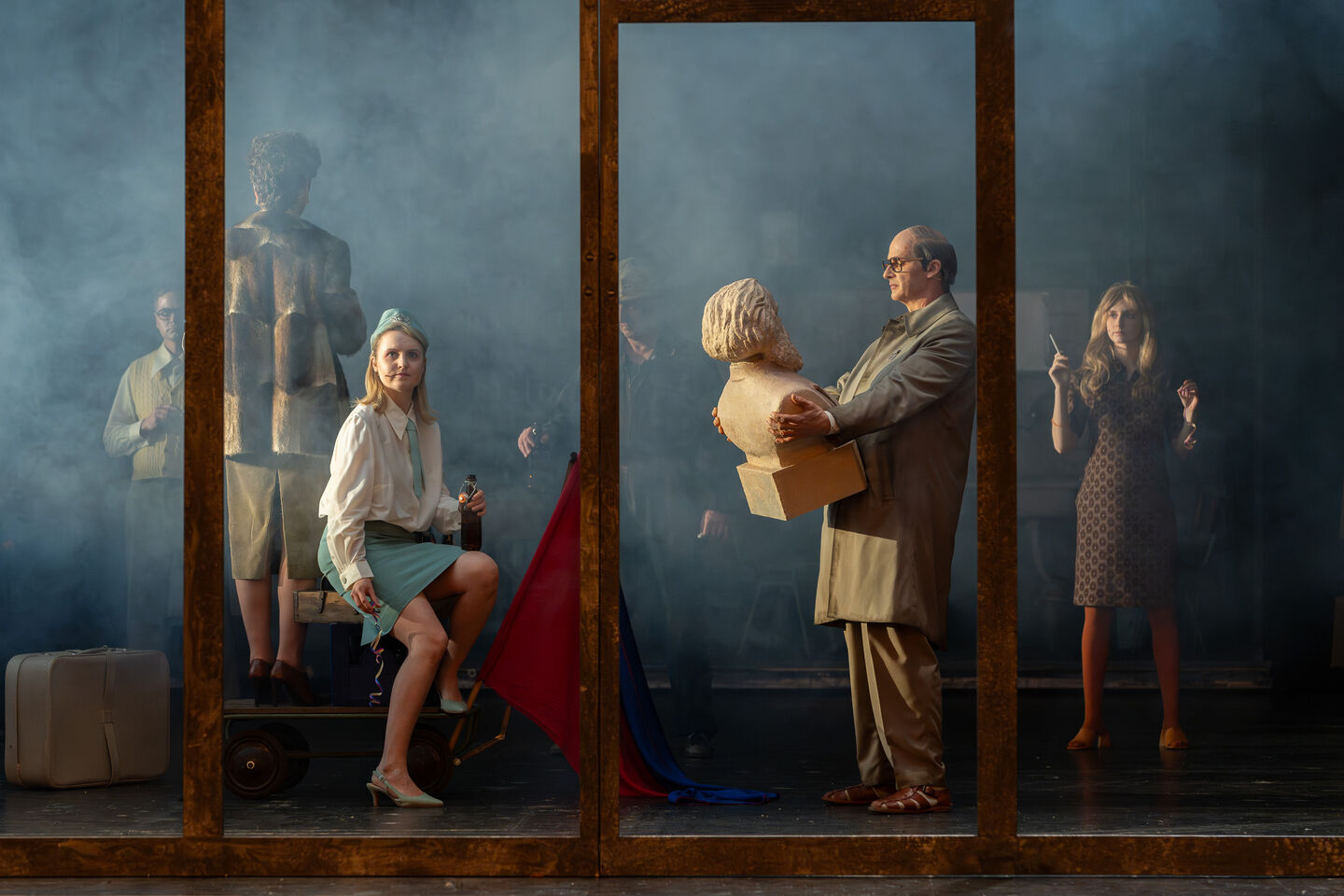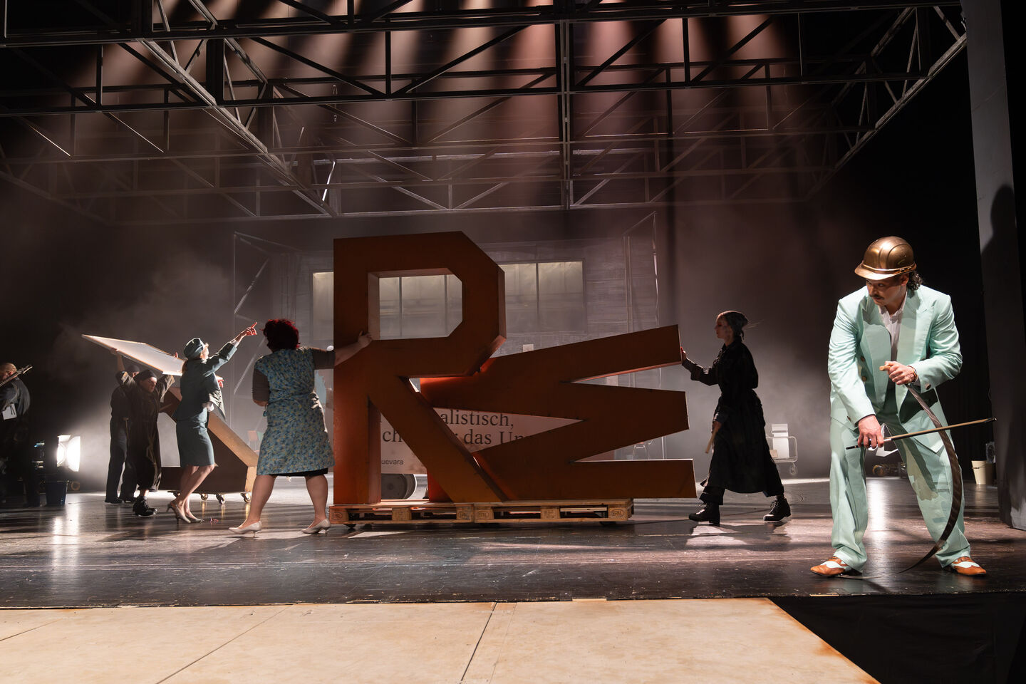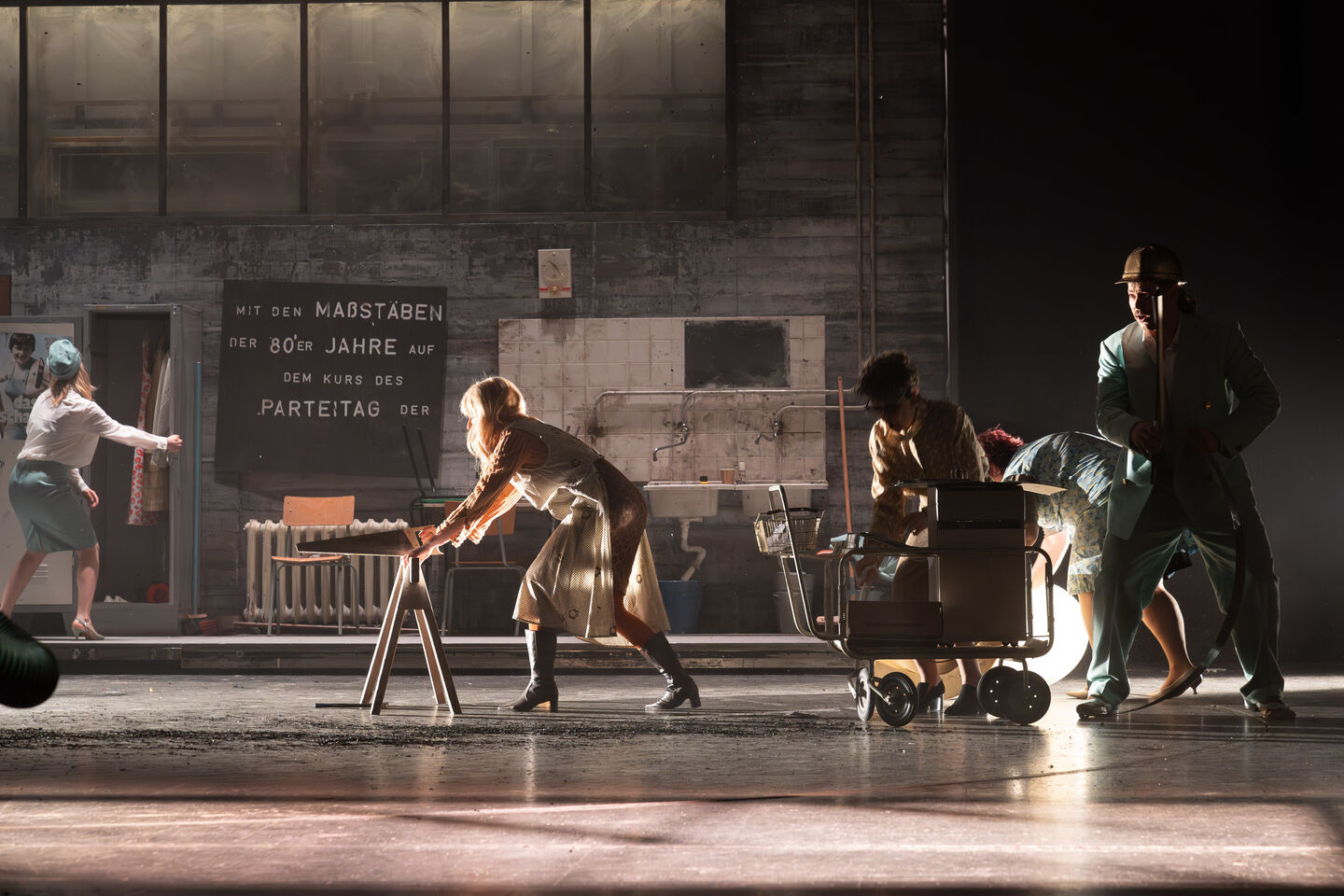 Auf der Blaupause der deutschen Wiedervereinigung verschieben sich in Petras‘ Inszenierung die Vorgänge im dänischen Königshaus auf die sozialen Dynamiken dieser Wendejahre. Der reduzierte shakespearesche Figuren-Kanon findet sich in und um einen ostdeutschen Betrieb wieder, welcher sich in den damaligen „Sanierungen“ befindet. Es zeigt sich, wer sich abrupten Veränderungen anpassen kann, wer seinen Anspruch auf das eigene Lebensglück zu stillen vermag und wer im Spiegel der Ereignisse dem Wahnsinn verfällt.