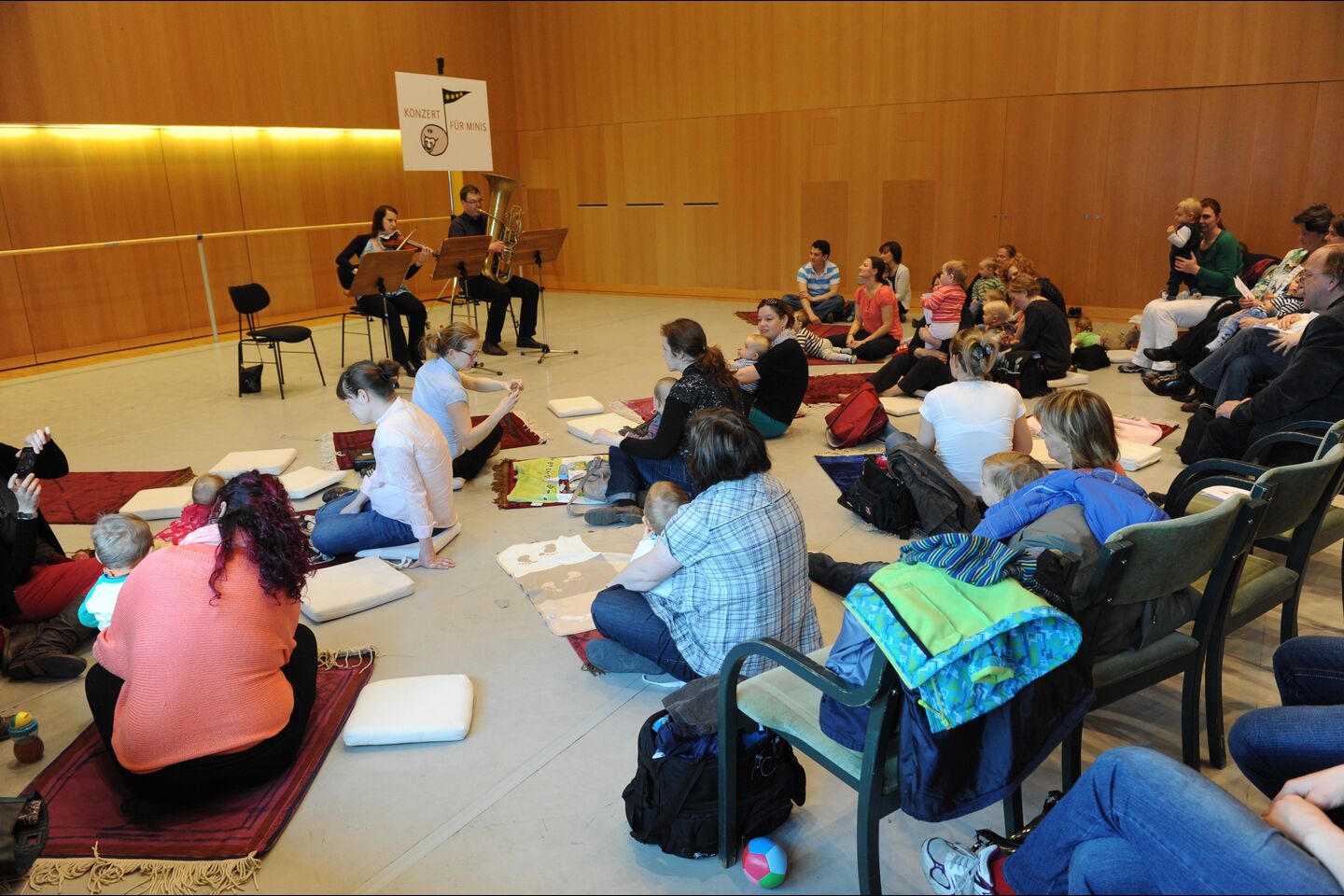 Der größte der Probenräume ist dem Philharmonischen Orchester vorbehalten. Die akustische Ertüchtigung der ehemaligen Garage hat nicht nur vorzügliche Probenbedingen geschaffen. Die ermöglicht auch die Nutzung des Saales für kammermusikalische Unternehmungen der Orchestermitglieder. Die finden sich zum einen in einer Reihe von acht Konzerten immer samstags 20.00 Uhr. Zum anderen stecken die Musiker viel Kraft in Konzerte für die Allerkleinsten. Unter der Leitung von Flötistin und Konzertpädagogin Stefanie Platzer spielen sie Konzerte für Minis (Kinder bis 2 Jahre) und Mucki-Konzerte (Kinder zwischen 3 und 5 Jahren).